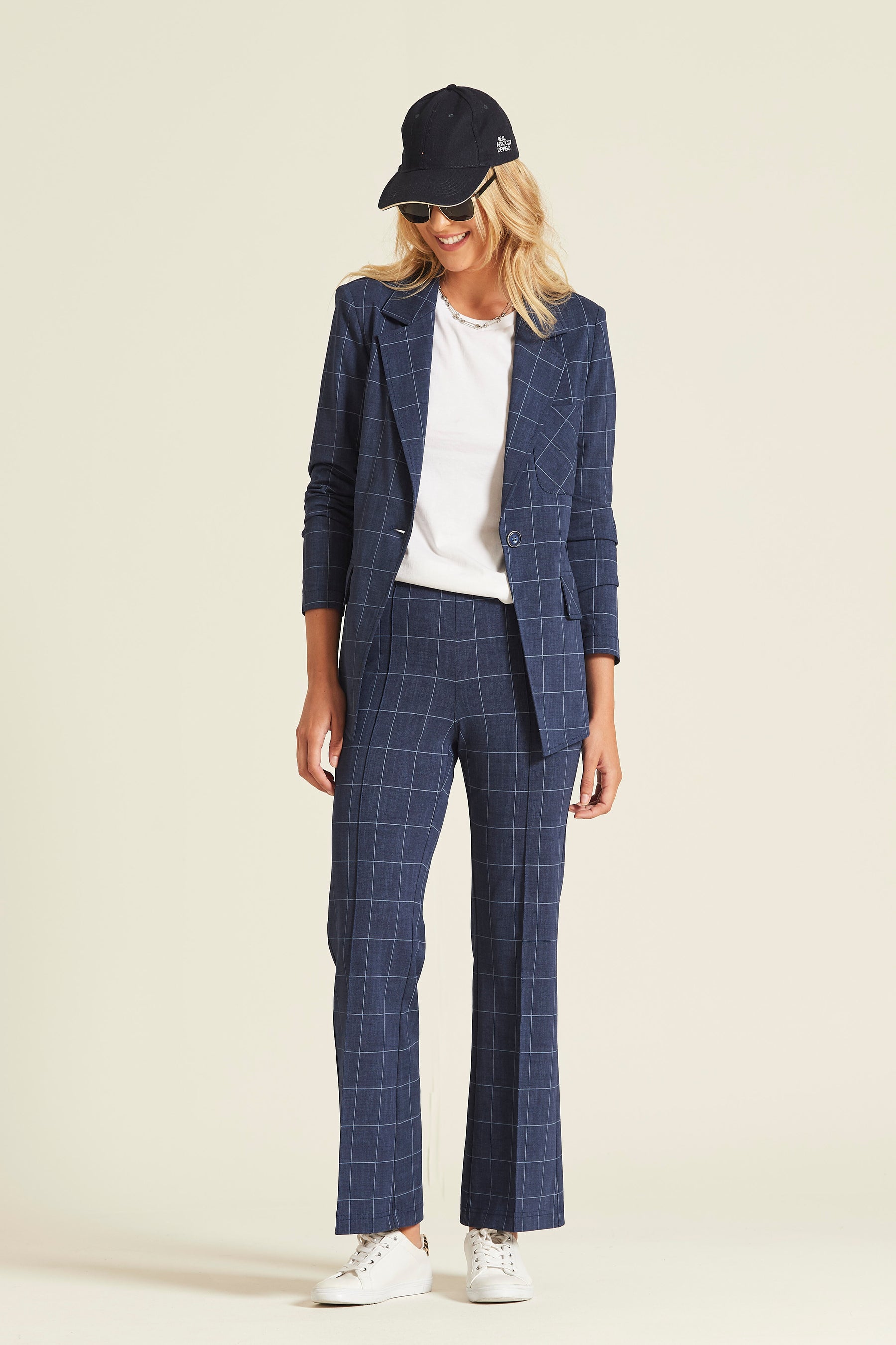 Pantalón confeccionado en punto Roma de gran confort con un clásico motivo de cuadro ventana en azul marino. Presenta una cómoda cintura elástica que garantiza un ajuste perfecto, diseño limpio sin bolsillos y una pernera de línea ligeramente acampanada