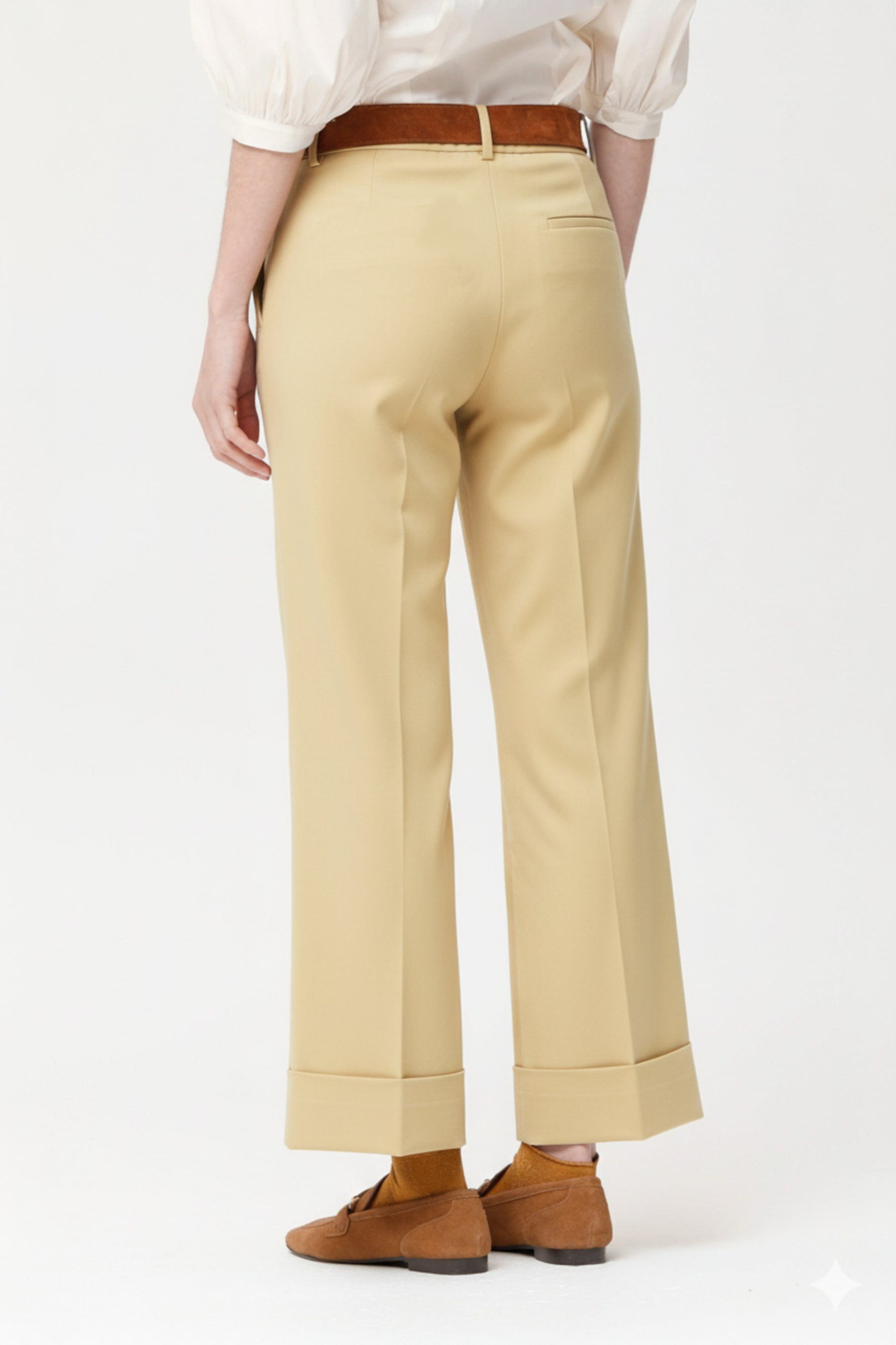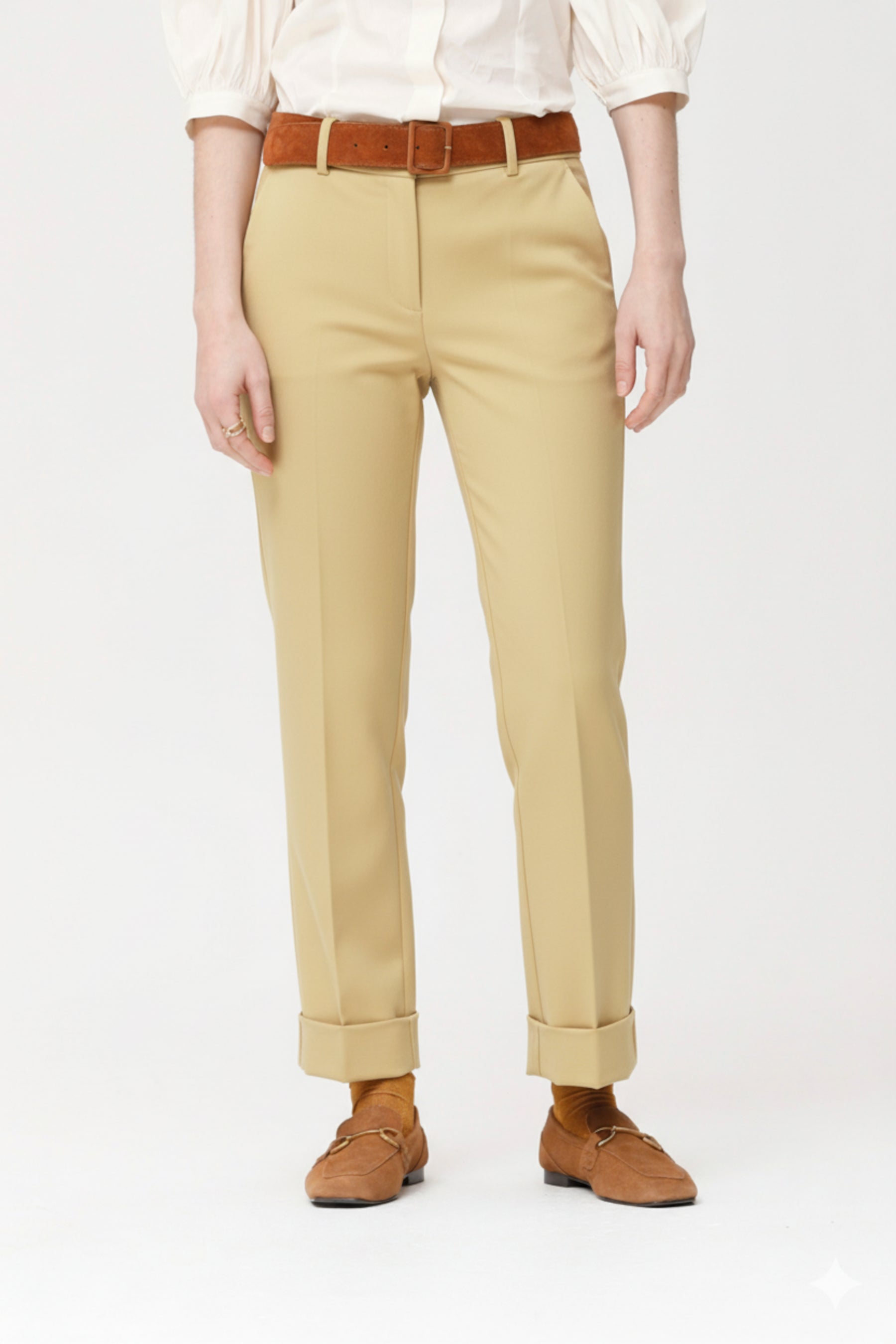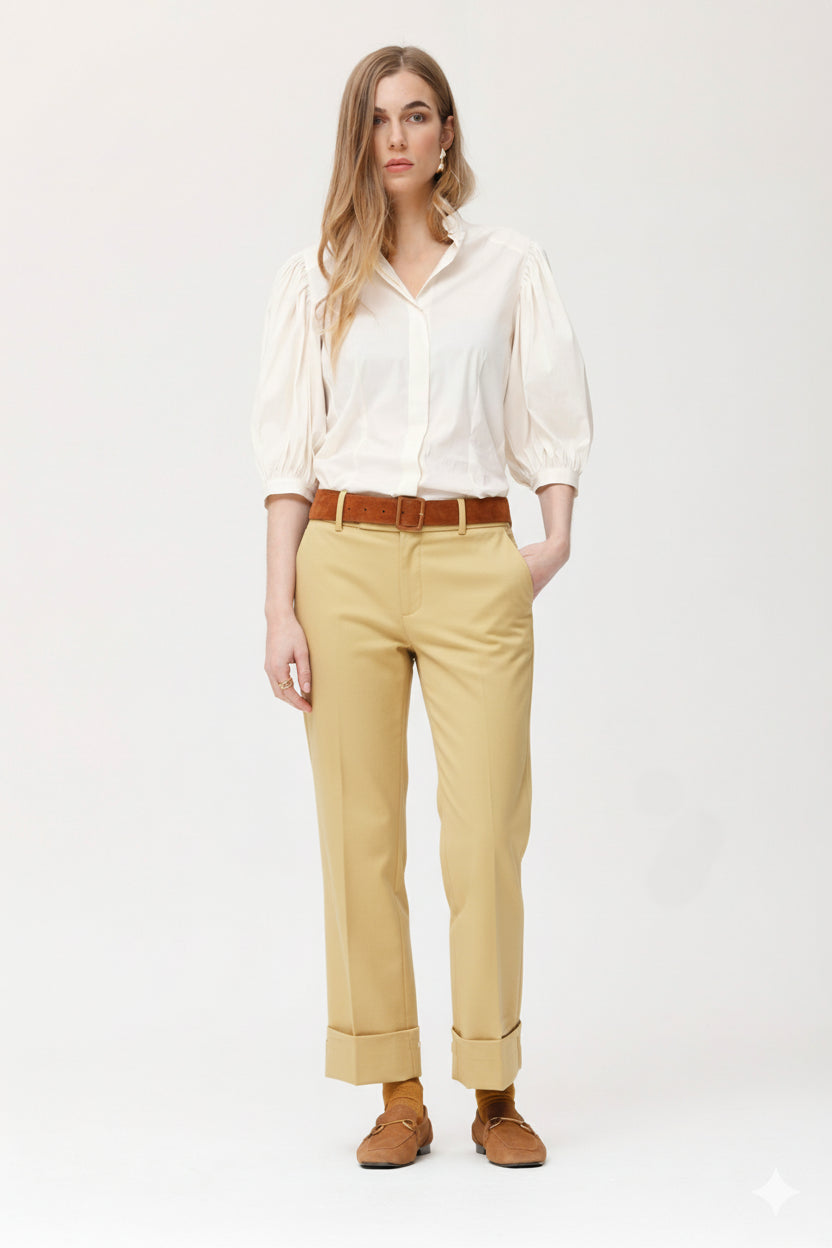 Pantalón en twill de algodón lavado, que ofrece una textura suave y agradable al tacto. Presenta corte recto y clásico, con cintura media, trabillas para cinturón y bolsillos laterales. El dobladillo vuelto en el bajo aporta un aire desenfadado y actual, ideal para looks casuales. Es una prenda versátil que combina a la perfección con camisas, blusas o prendas de punto y resulta cómoda tanto para el día a día como para ocasiones más formales gracias a su acabado impecable
