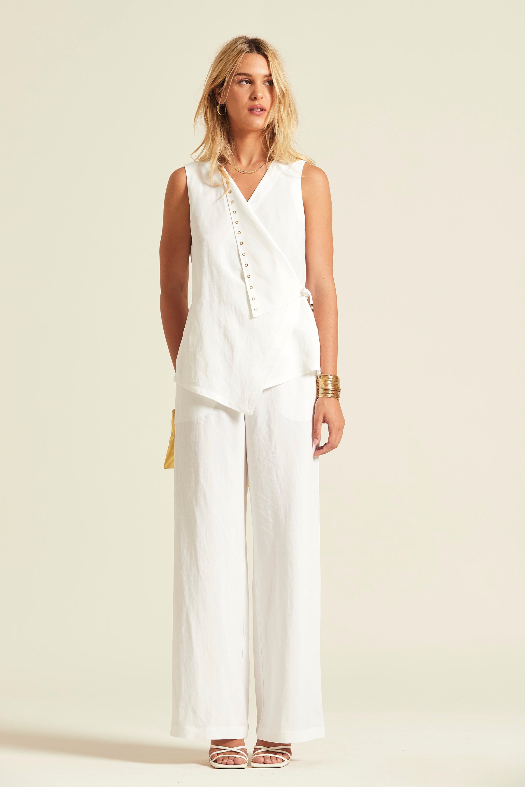 Top de tirantes anchos confeccionado en una mezcla ligera de viscosa y lino. Presenta un diseño asimétrico con cierre cruzado en el delantero, decorado con una fila de botones metálicos laterales y un cierre de lazada que permite ajustar la prenda a la cintura.