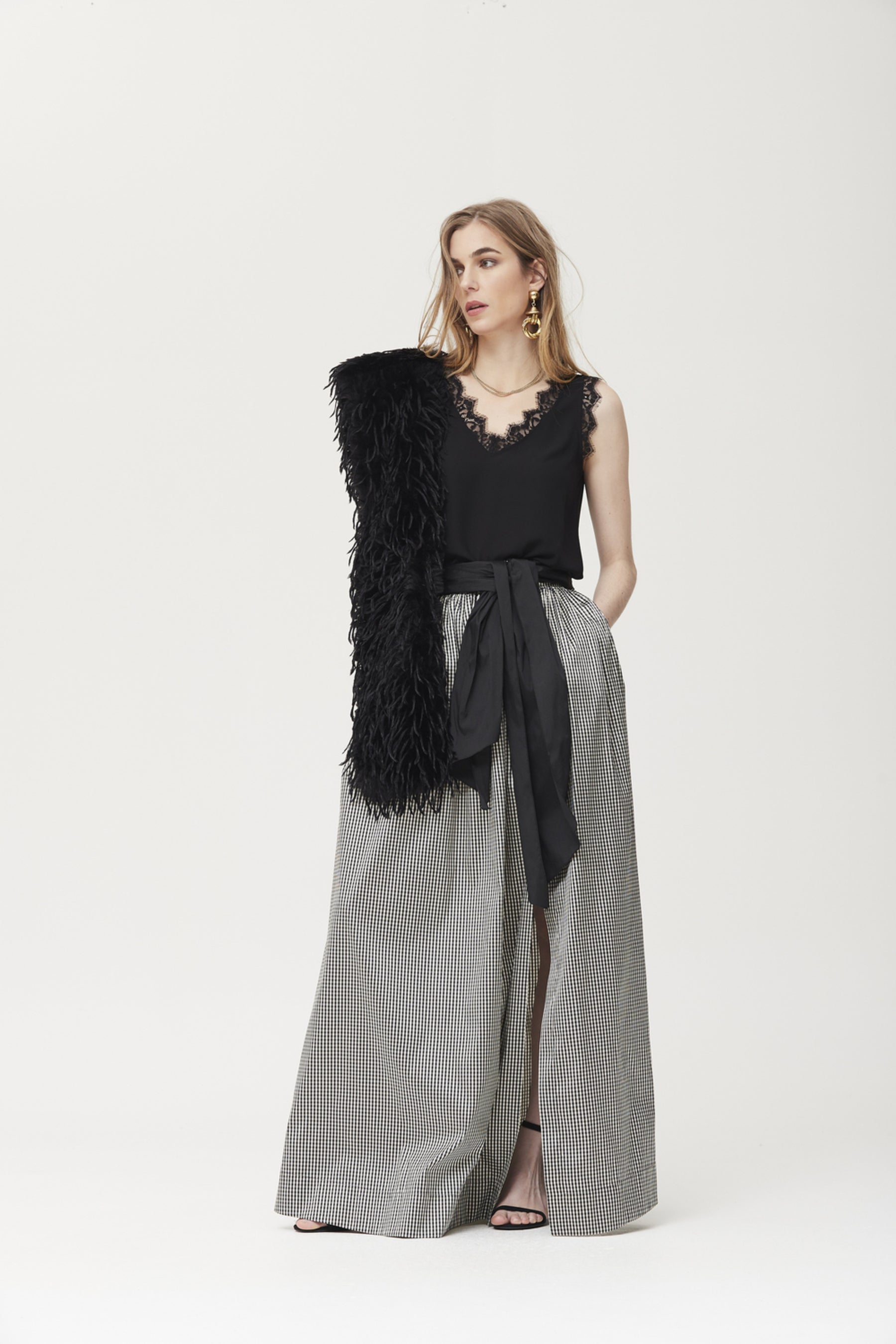 Top sin mangas confeccionado en gasa chiffon negra, con escote en pico y delicado ribete de encaje a tono. presenta un diseño ligero, vaporoso y elegante, ideal para combinar tanto en looks de fiesta como informales. su caída fluida aporta movimiento y frescura, mientras que el acabado transparente permite jugar con superposiciones o lencería especial. una prenda versátil y femenina, perfecta para destacar en cualquier ocasión.