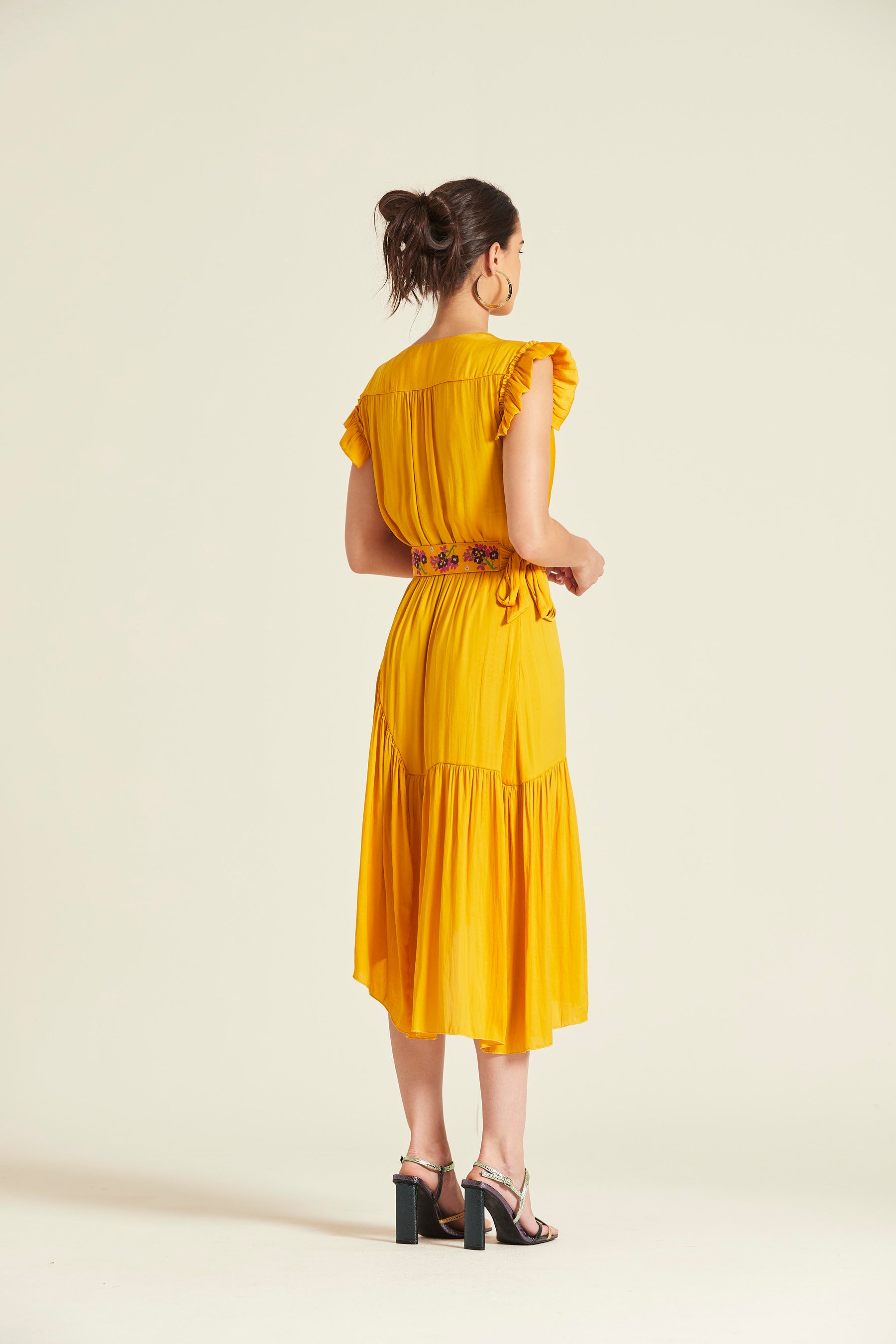 Vestido de largo midi confeccionado en un tejido muy ligero y con caída en color amarillo mostaza. Presenta un favorecedor diseño cruzado en "V", pequeñas mangas con volantes y una falda asimétrica con vuelo. Destaca por su cinturón ancho con bordados florales en contraste que realza la cintura.
