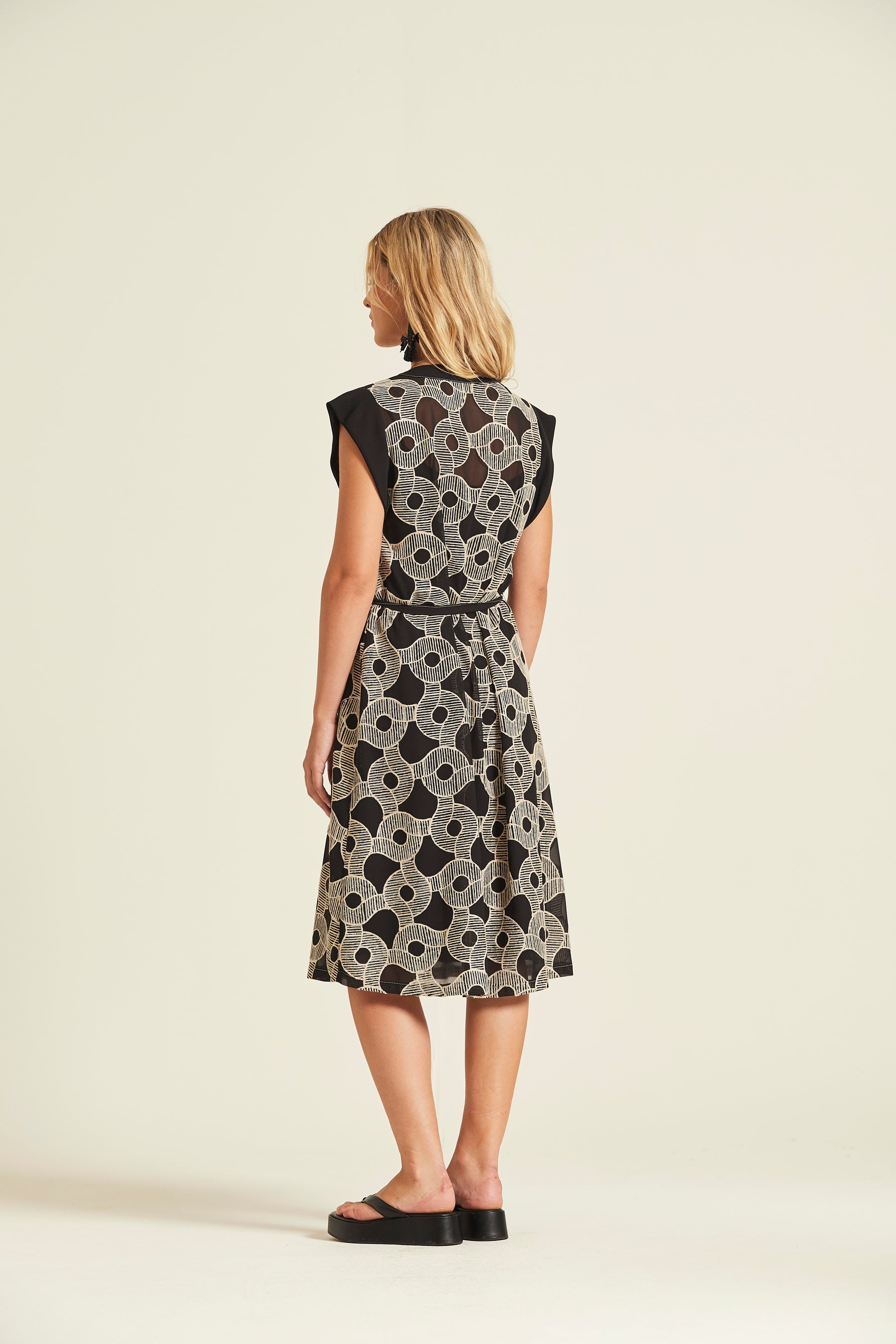 Vestido de largo midi confeccionado en una ligera gasa con bordados geométricos en contraste. Diseño de estilo camisero con cuello en pico, cierre frontal de botones y manga corta de corte japonés. Incluye un cinturón de cordón fino con detalles de abalorios para ajustar la cintura.
