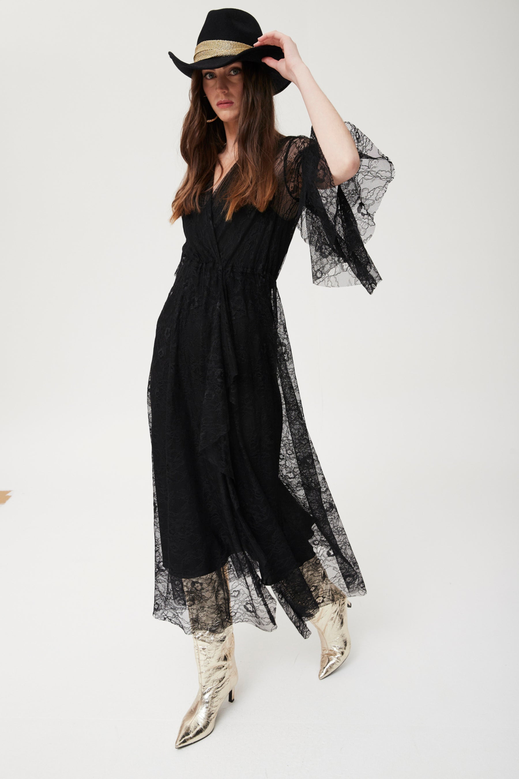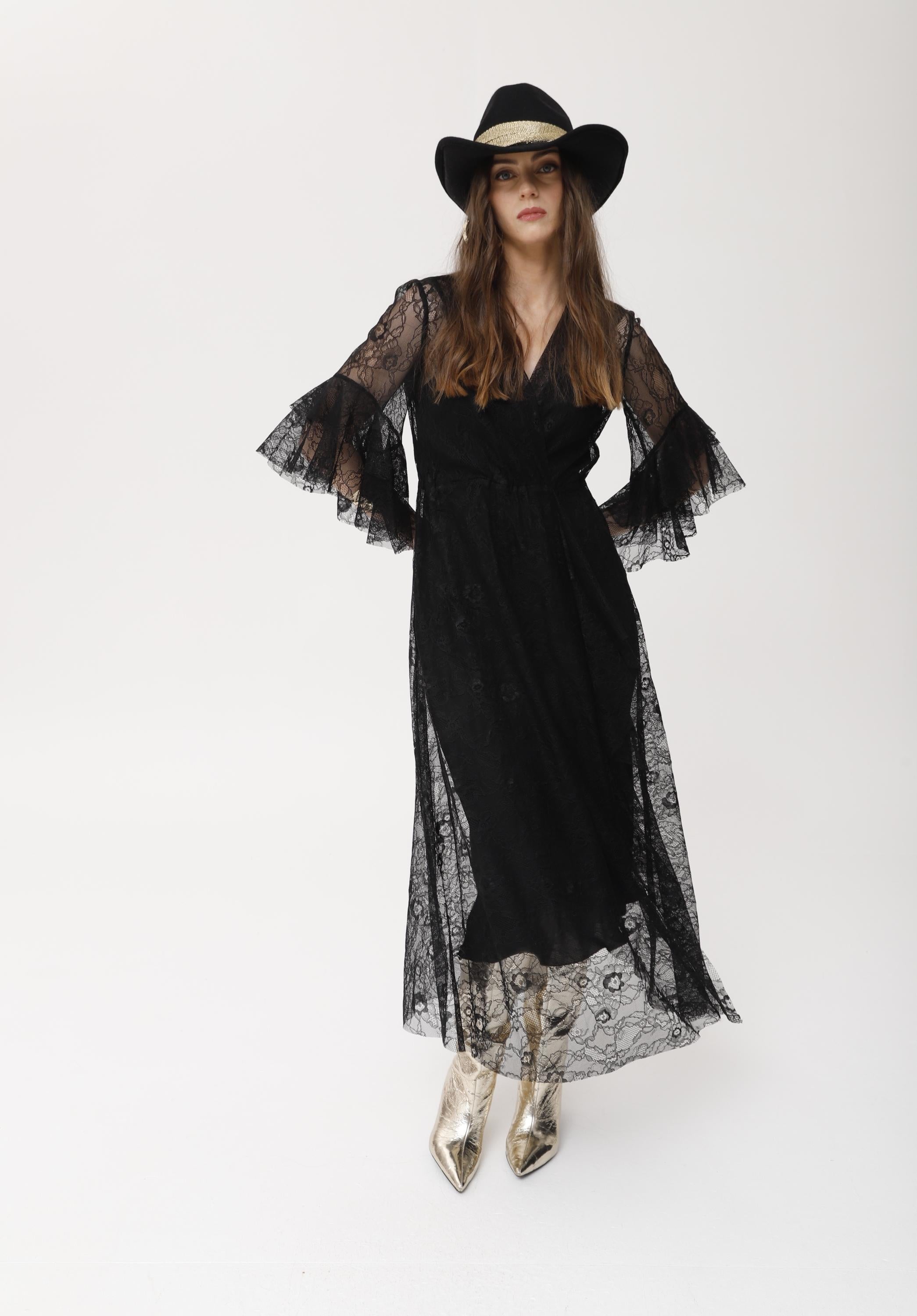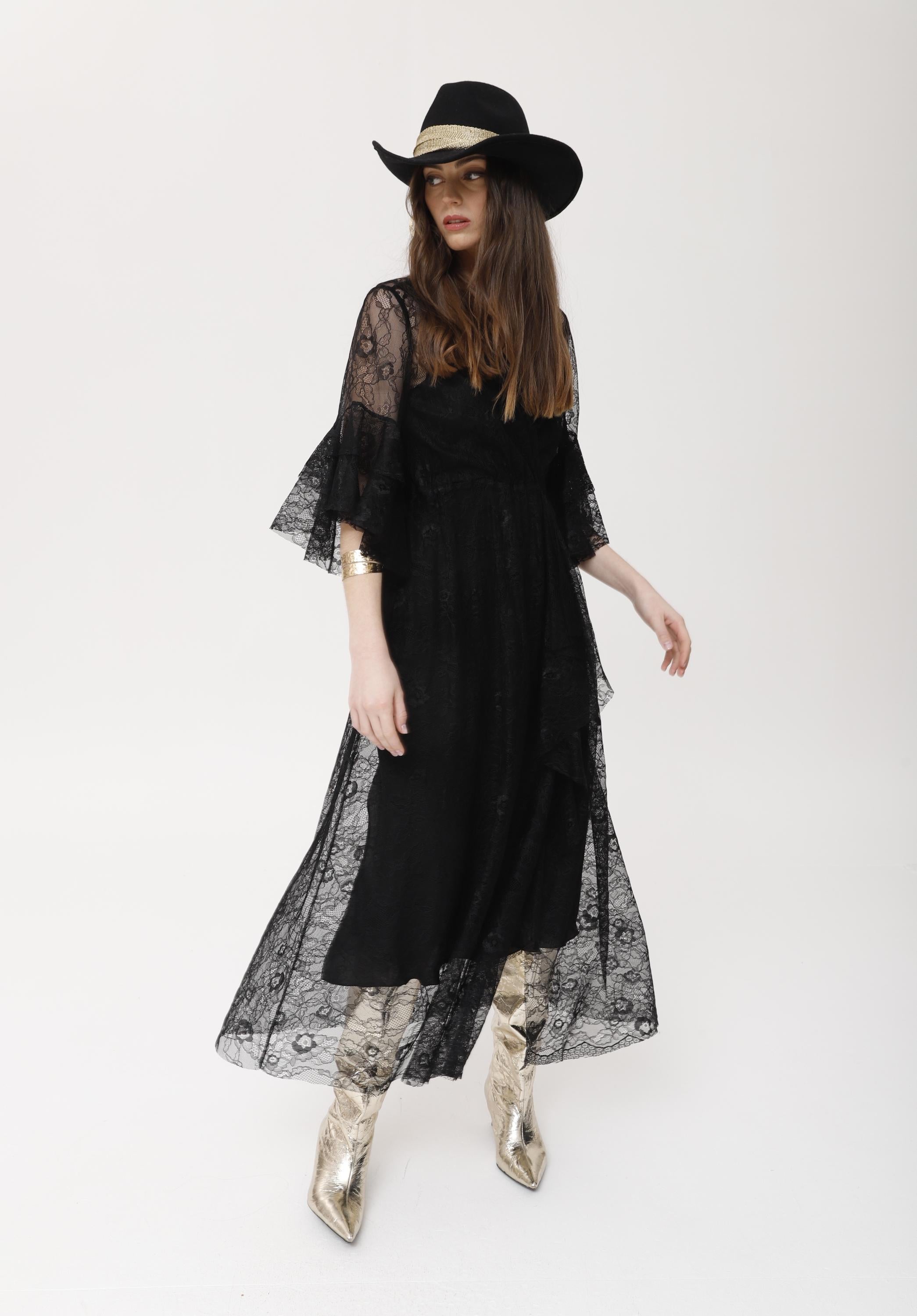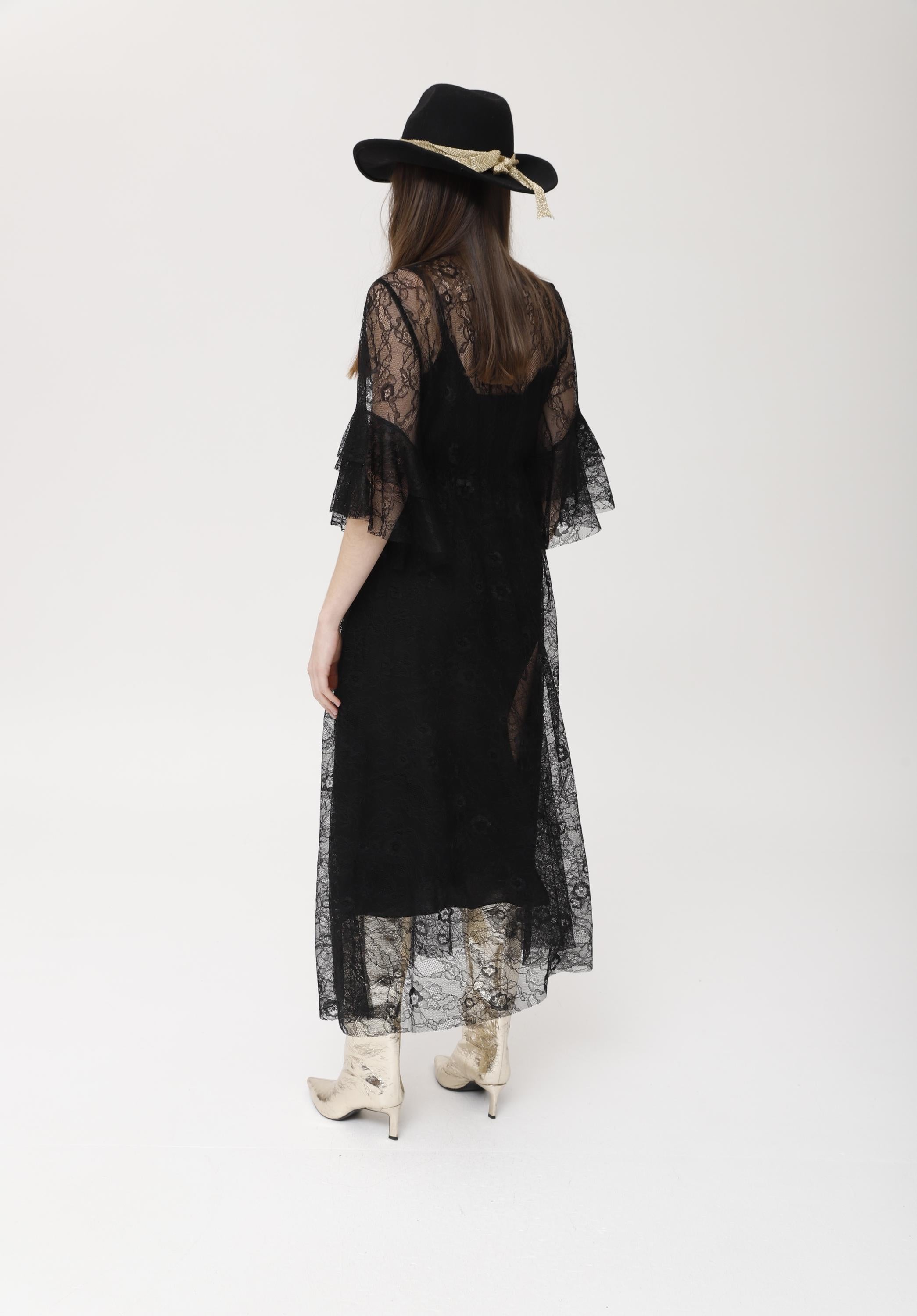 Vestido largo confeccionado en delicada encaje chantilly negro, con diseño envolvente y mangas amplias de volante. presenta una silueta ligera y femenina, con transparencia estratégica y caída elegante. es ideal para eventos y celebraciones especiales gracias a su aire retro y glamuroso; se puede llevar con botas o sandalias para personalizar el estilo, y destaca tanto solo como sobre vestidos lenceros o básicos. un imprescindible para quienes buscan sofisticación y originalidad.