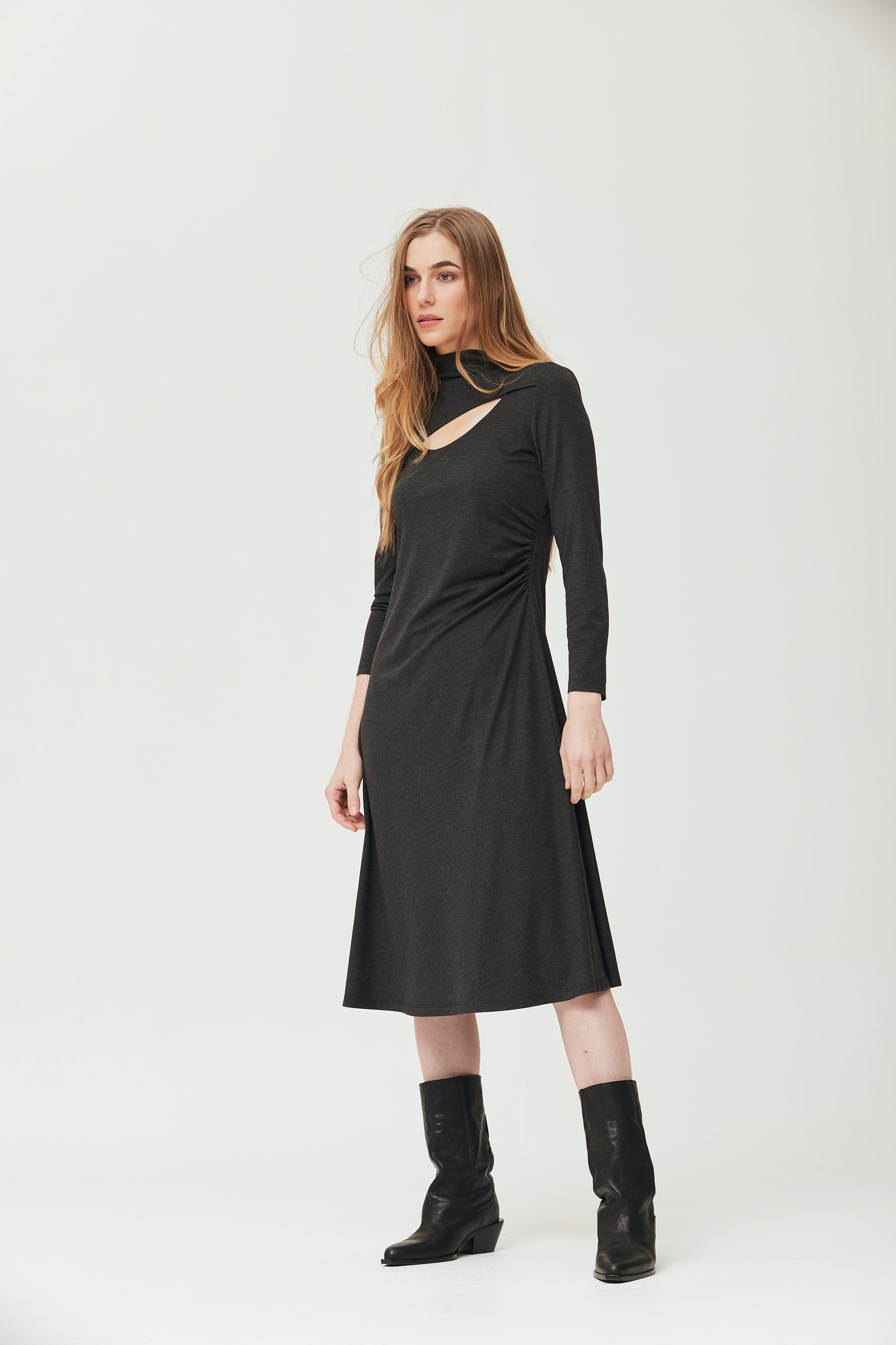 Vestido Midi En Punto Ligero. Manga Larga Con Frunce En Costado Y Abertura En Escote, Altura Modelo 1,75Cm